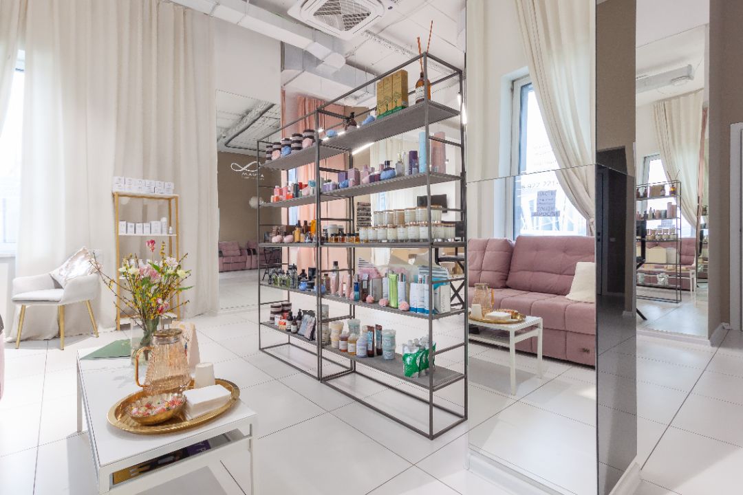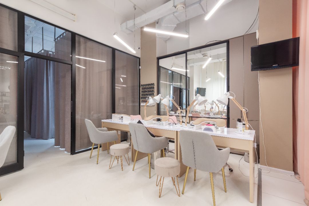 Интерьер выполнен в светлых тонах, с мебелью из износостойких материалов: акрилового камня, алюминиевого профиля, стекла и металла. Каждый элемент продуман до мелочей, чтобы гости салона чувствовали заботу, уют и гармонию во всём.